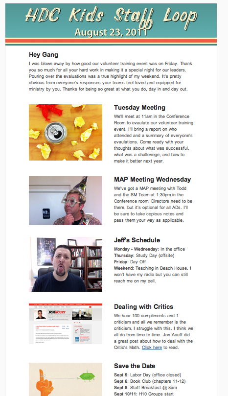 This is where I communicate upcoming events, changes, birthdays, meetings, what we’ll be teaching on, our volunteer schedule, etc. I try to keep this as short and to the point as possible. Whenever I write this section I try to filter it through these questions from Andy Stanley’s Communicating for a Change (Andy’s book is geared for preaching, but I have found these questions are a great filter for just about any kind of communication):