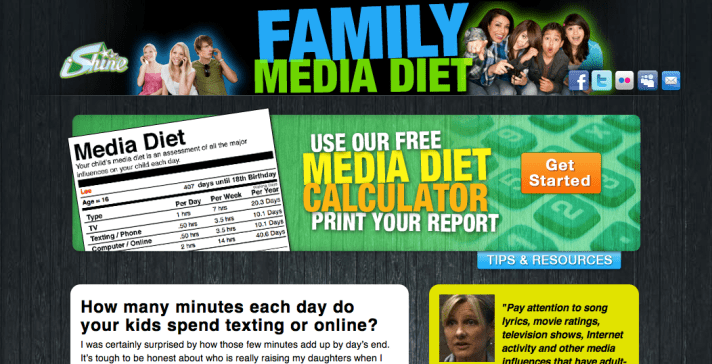 A few days ago I came across this cool website from the folks over at iShineLIVE.com. Basically, it’s a calculator that adds up all of your media time (TV, internet, cell phone, video games, etc.) with all of your “real world” time (family time, church, sports, etc.) and gives you a breakdown of your media diet. Here’s a little more about it: