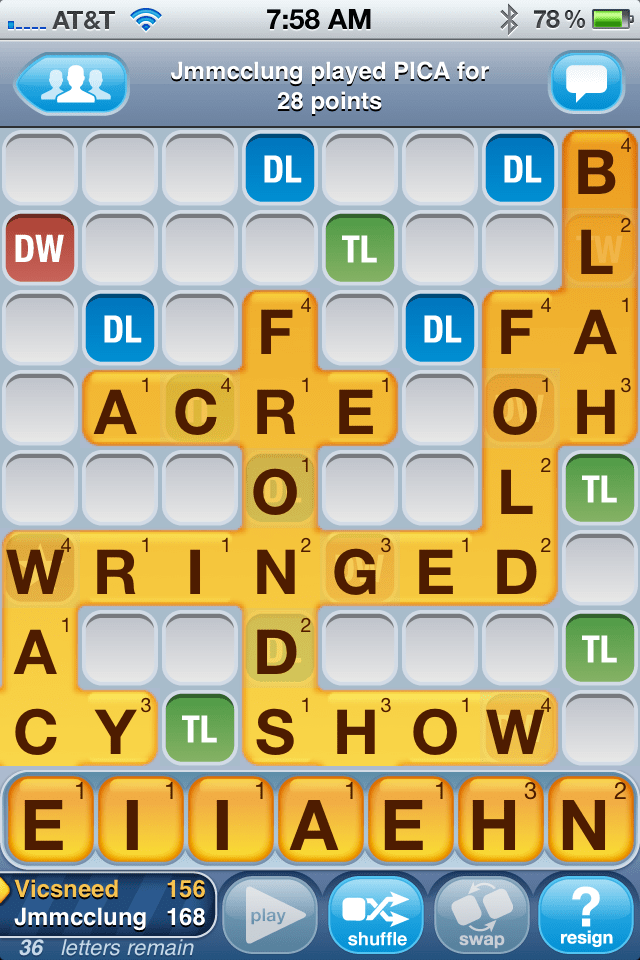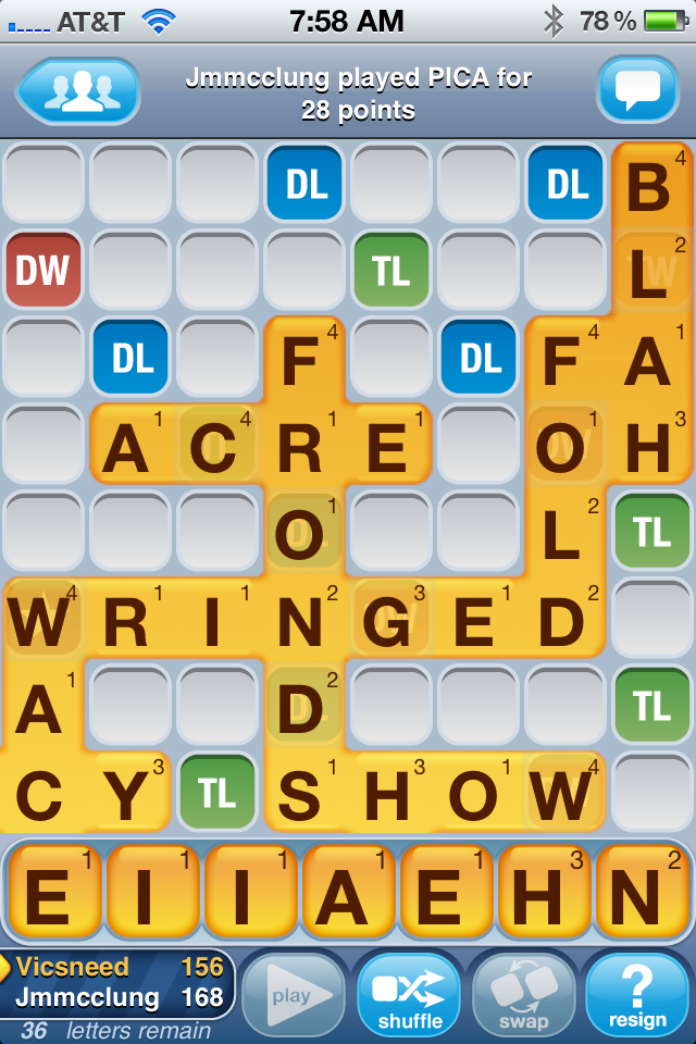Last Sunday I couldn’t think of a word to play. I turned to my wife to help me crush her dad. She was only to happy to help.