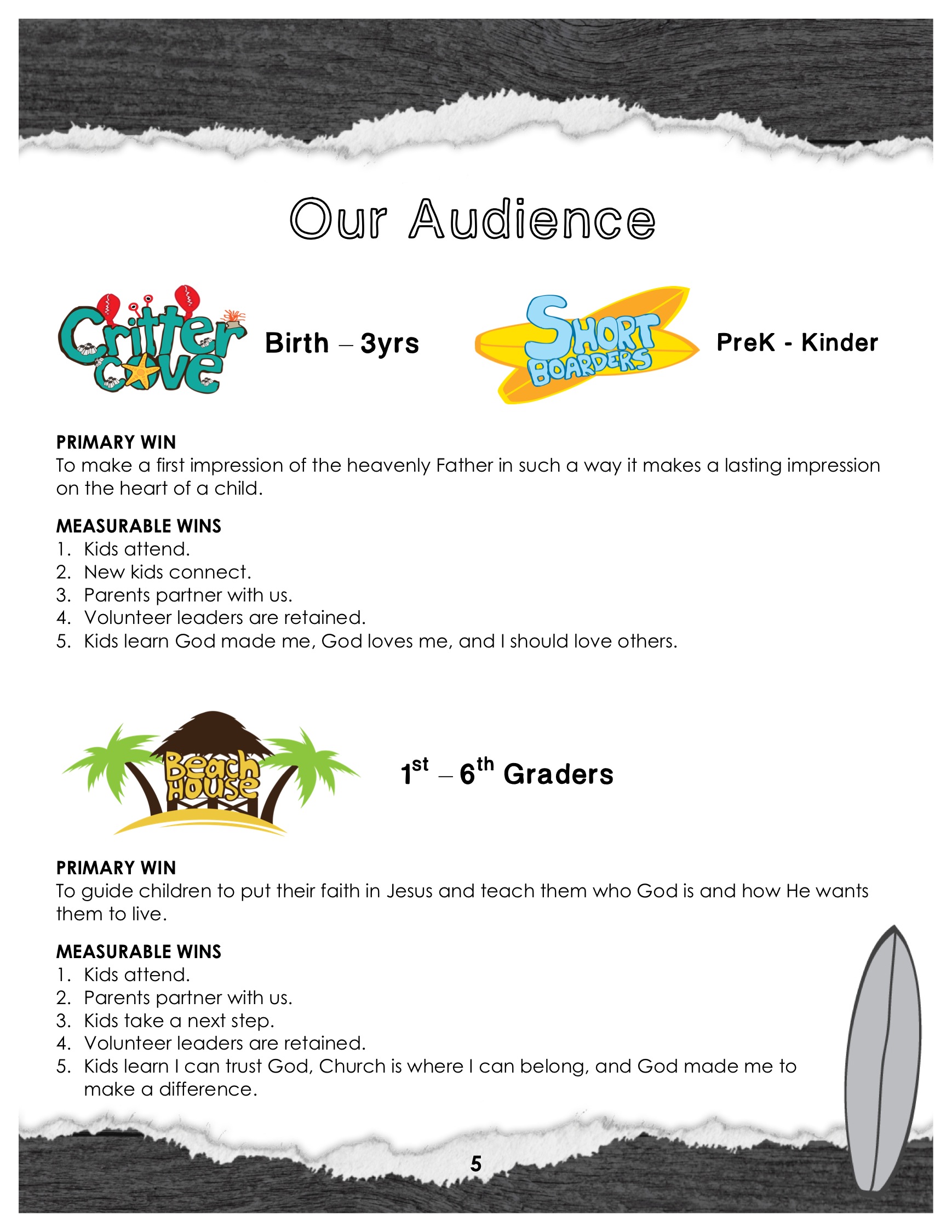To help clarify what a win looks like in our ministry my team and I put together this sheet that we’ll roll out in our volunteer orientation handbook later this month. In it we’ve listed what the primary win in each of our ministries is as well as some of the other wins that take place on the weekend and during the week.